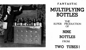 Felsman's trick is an extension of the old Passe Passe Bottle and Glass, which dates back to the mid-1800s. Multiplying Bottles starts out with a single bottle and a glass, which change places when covered with tubes, just as in the Passe Passe trick. But then the trick suddenly veer off in another direction, and ends with a startling production of 8-9 bottles.